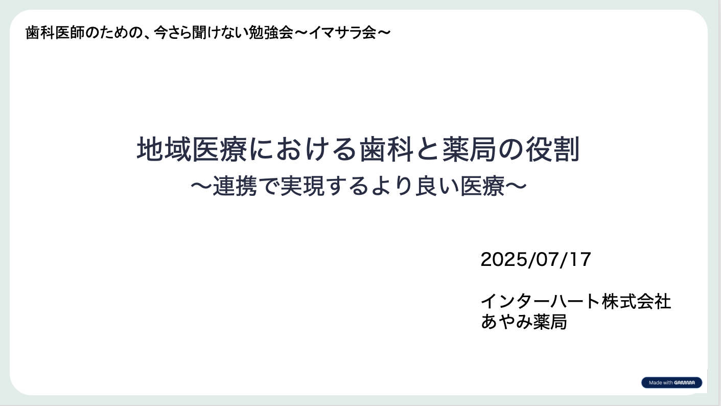 若手歯科医師中心の「今さら聞けない勉強会〜イマサラ会〜」に、あやみ薬局の薬剤師が講師としてお声かけいただき、「地域医療における歯科と薬局の役割 〜連携で実現するより良い医療〜」と題して、オンラインにて、90分お話しをしました。